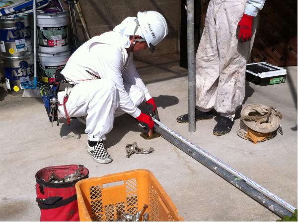 足場架設。作業がしやすいように安全な足場づくりをします。 |