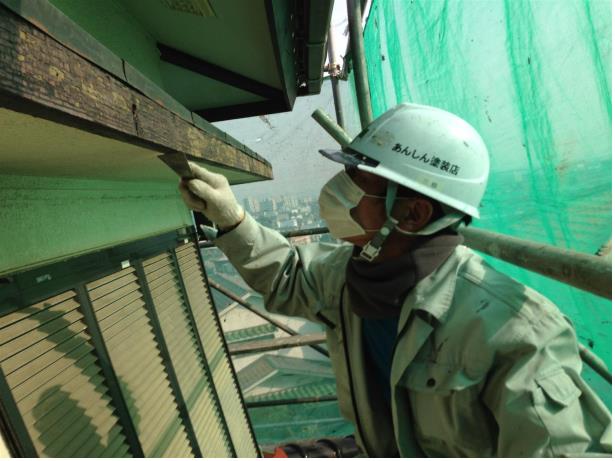 木部のケレン作業です。表面のめくれている部分を綺麗にします。 |