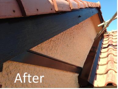 下塗りの後に中塗りをします。U様のお選びになったお色(トスカニー8073)を塗っていきます。右側のオレンジ色の部分が中塗りです。 |