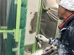 外壁下地には、ものが当たったりして欠けている部分が結構あります。そのまま塗装をしてしまうと、欠けている部分が目立ってしまいます。せっかく外壁が綺麗になったのに、その部分が気になったのでは、満足度ももう一つということになりかねません。こんな一手間が完成度の高い塗装にはかかせません。