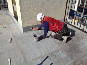 防水層はまだ大丈夫で、トップコートのみが歩行などで磨耗している状態なので、今回はトップコートのみ塗装をします。