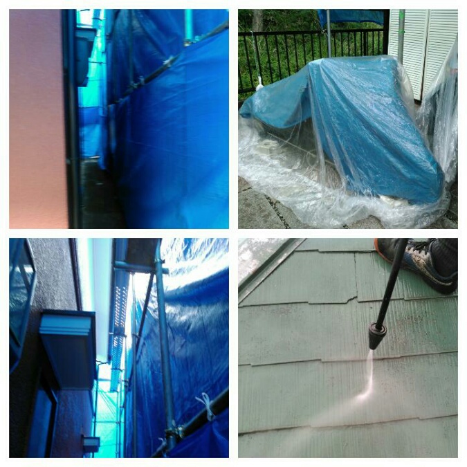 ご近所に前もってご説明しながら車などにシートカバーをかけ、お隣のお家が真横にある場合は全面メッシュシートとブルーシートで二重シートによる養生が必要です。