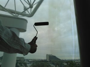 レストランからの眺望は、神戸港を一望出来ます。これをブラインドで覆うと眺望が無くなってしまいます。窓ガラスからの暑さ対策のため、遮熱コーティングを施工します。