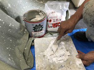 先ずは、下地処理からです。天井板の隙間にパテを塗って行きます。(インターナショナルペイント(株)製のパテ、アイピーパテ青缶)に工作に使う石工を混ぜて練ったものを使います。