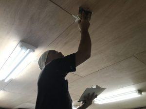 店舗の天井塗装です。下地処理に、板の隙間にパテを塗って行きます。