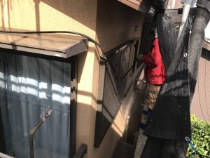 高圧洗浄後は、丸一日充分に乾かしてから次は外壁の養生作業です。