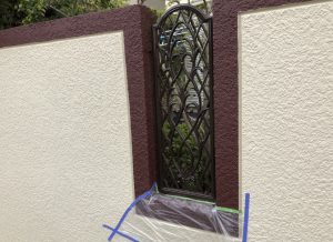 ペンキのついてはいけない所をビニールで覆います。養生のコツは、外した時に線が真っ直ぐになるようにピシッと貼ることです。養生の出来不出来で塗装の仕上がりに大きく影響が出ますので気を込めて作業を進めます。