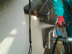 足場仮設が完成したあとは、高圧洗浄機で、洗浄を行っていきます。