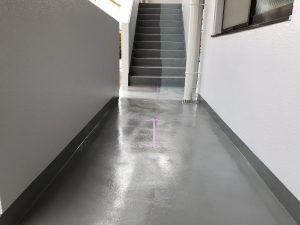 廊下の床を塗装します。マンションの住人の方が歩けるように廊下の真ん中で区切って左右半分ずつ仕上げていきます。ピッカピカに仕上がった廊下や入り口の扉などもまっさらでまるで新築のマンションのようです。