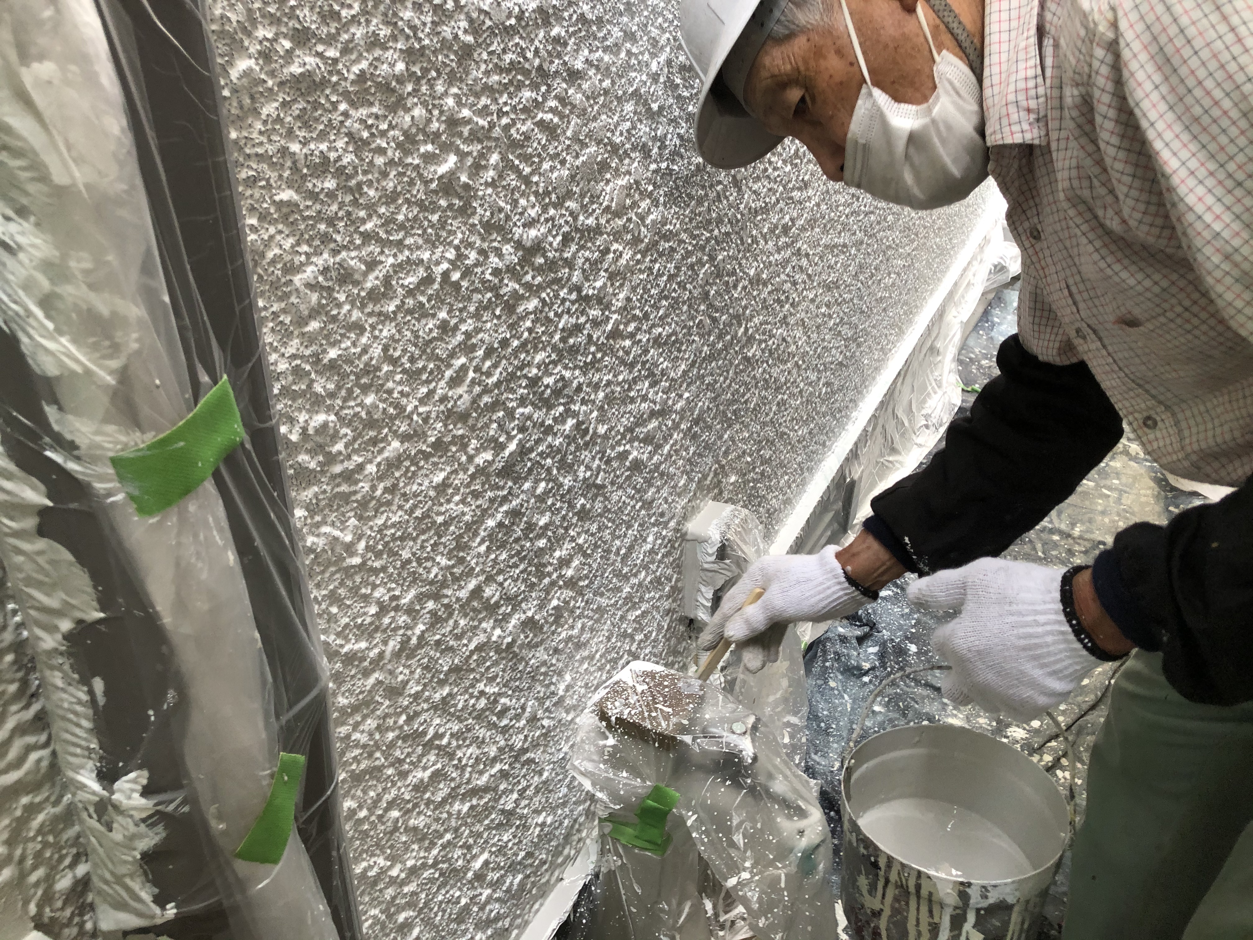 一旦外壁が真っ白になりますが、これは下塗りでこの後にお選びいただいた色に仕上げますのでご心配は無用です。下塗りの役割はファンデーションのように傷んだ下地を整えることと、この上から塗る上塗り材との接着力を高めるという役割があります。