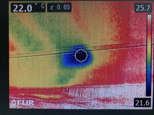 そこでサーモグラフィーは当ててみます。すると、おや?どうやら怪しい?という場所が分かります。後はこの周辺を補修してみて様子をみてみましょう。次の大雨でのテストが出来ます。