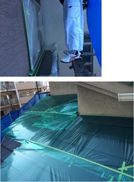 <ツートンカラーのモルタル外壁に地球クールペイント遮熱防水塗装 西宮市Y様邸 外壁・屋根塗装の様子