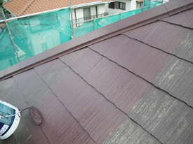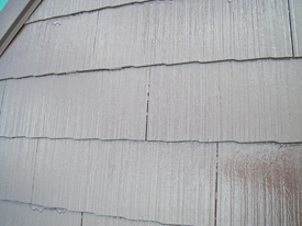 中塗りです。カラーべストの塗装は美観上のこともありますが、アスベスト飛散を防ぐためでもあるのです。 |